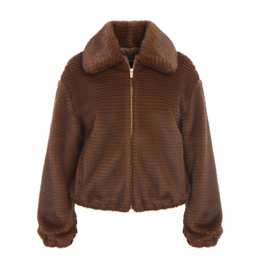 Indulge in cozy style with this rich brown faux fur bomber jacket. Designed for both warmth and a chic, contemporary look, this jacket is an essential addition to your cold-weather wardrobe.
