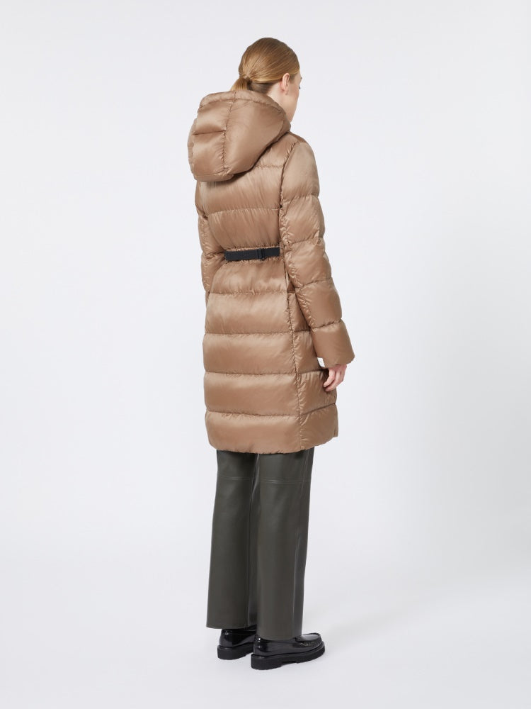 Midi down jacket featuring a straight silhouette with an elasticated waist at the back.