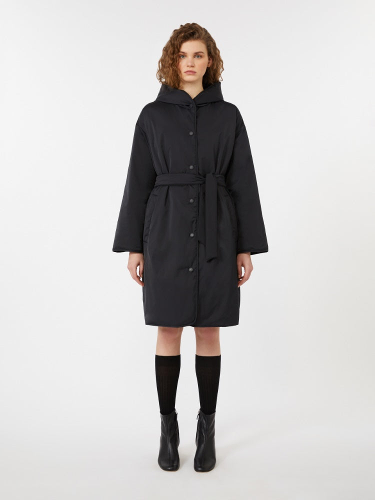 Reversible down jacket with robe silhouette and matching belt at the waist.