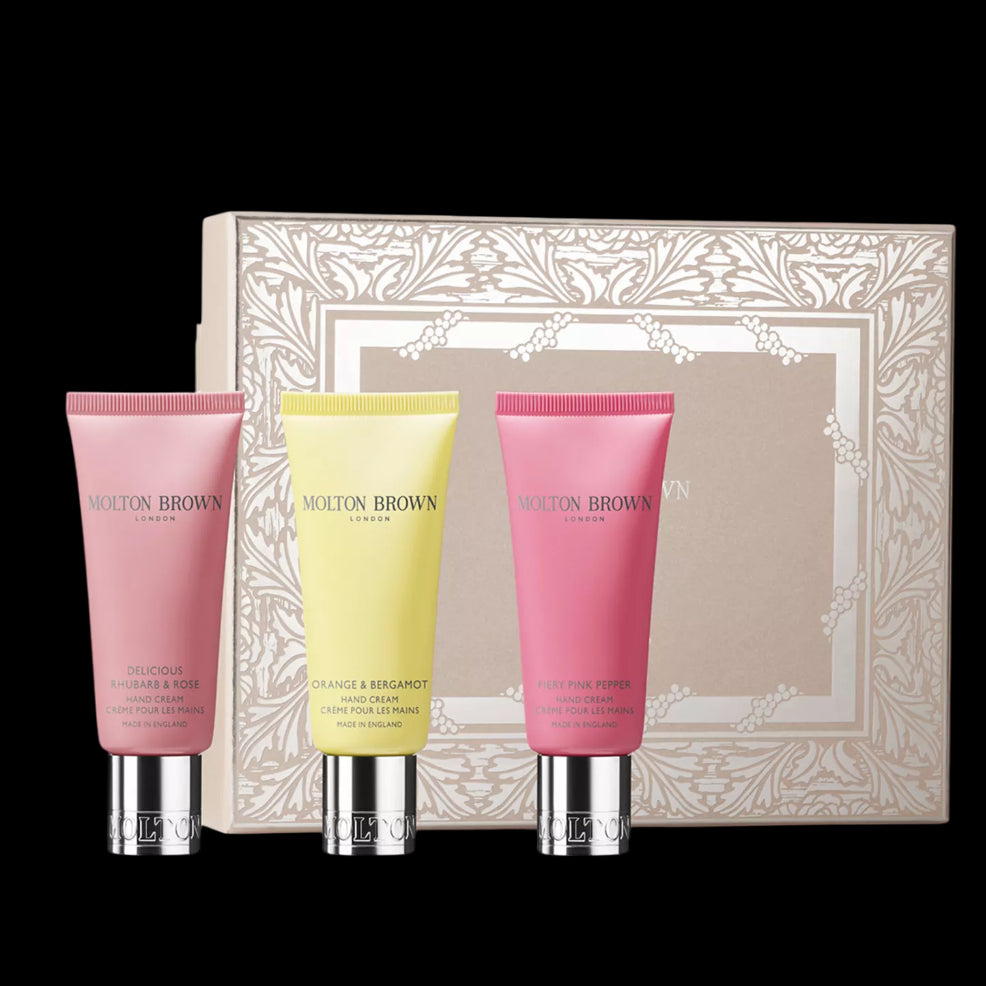 An on-the-go hand cream trio in Molton Brown's classic fragrances. Infused with shea butter and meadowfoam seed oil for nourished results and reassuring softness. Beautifully scented with sweet floral, radiant citrus or sultry spiced notes. Keep as a grand gift for yourself or as the ultimate scented surprise for someone you love.