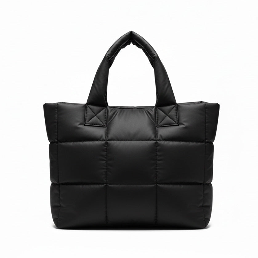 This large size tote features a plush, quilted puffer design. Perfect for adding a bold, chic statement to any outfit. Equipped with structured handles for easy carrying.