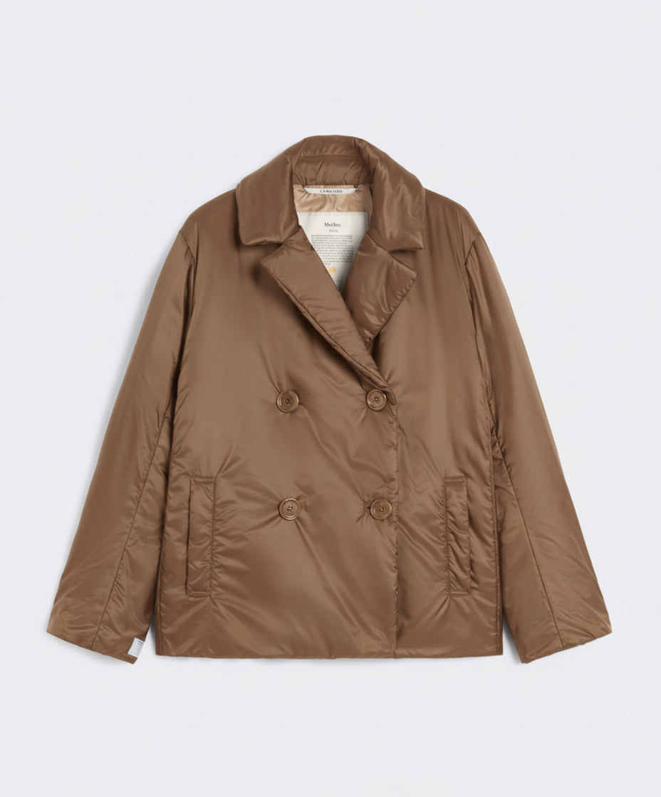 Padded pea coat-style jacket, with wide dual-use lapel collar and long sleeves.